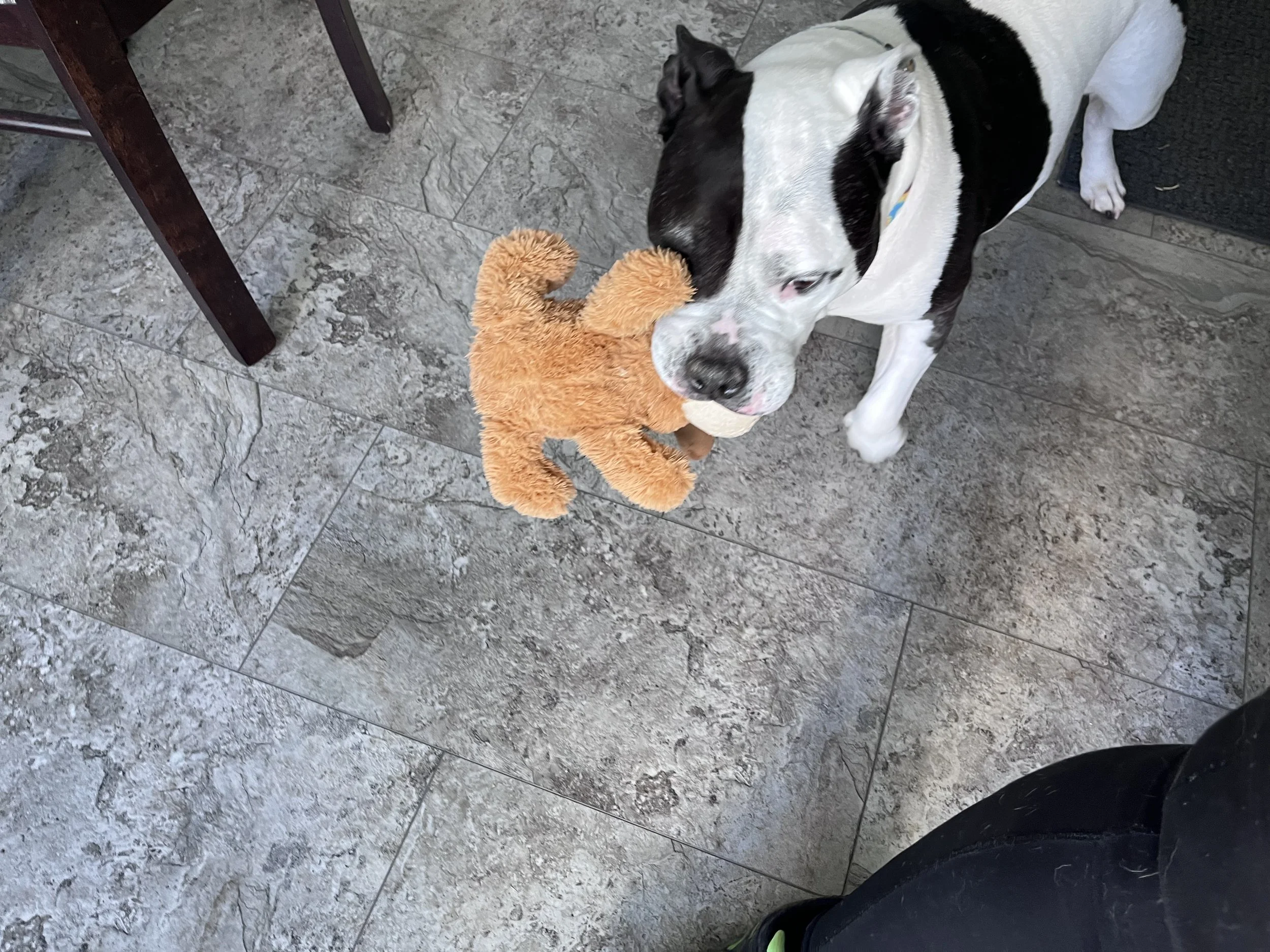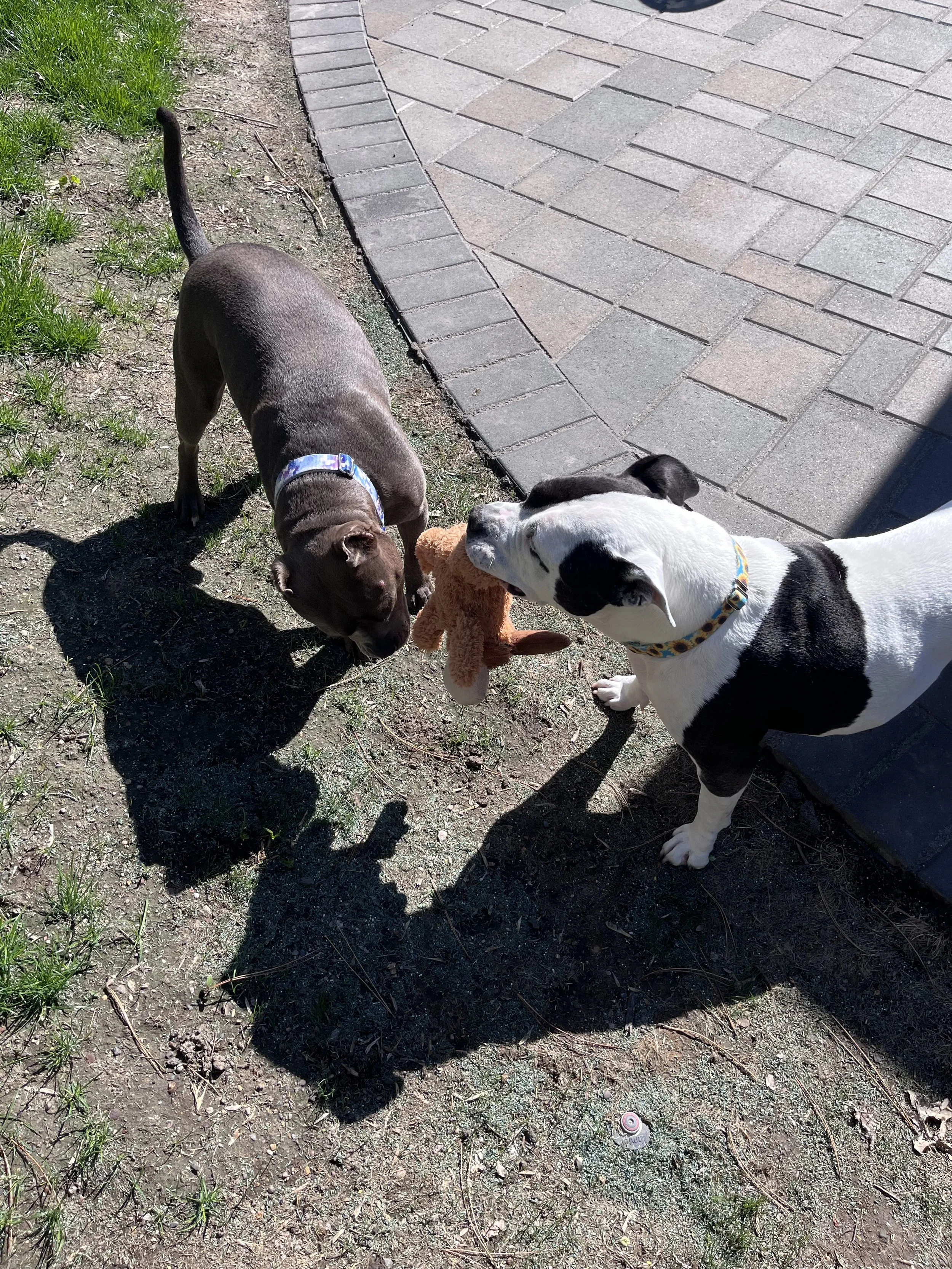 Enter Fi. Ce’s luck changed when he landed a foster home with a built-in role model: Fi. Described by her mom as “everyone’s FAVORITE girl”, Fi is an 70 lb land hippo with a heart of gold and a couple creaky legs tht don’t work quite as well as they used to. From the very first meeting, Ce was smitten. With me, tug-of-war meant he nearly pulled my arm from its socket. With Fi, he played gently, letting her waddle around in triumph after every win while he zoomed circles around her. For a dog who couldn’t regulate his own energy, this was huge.