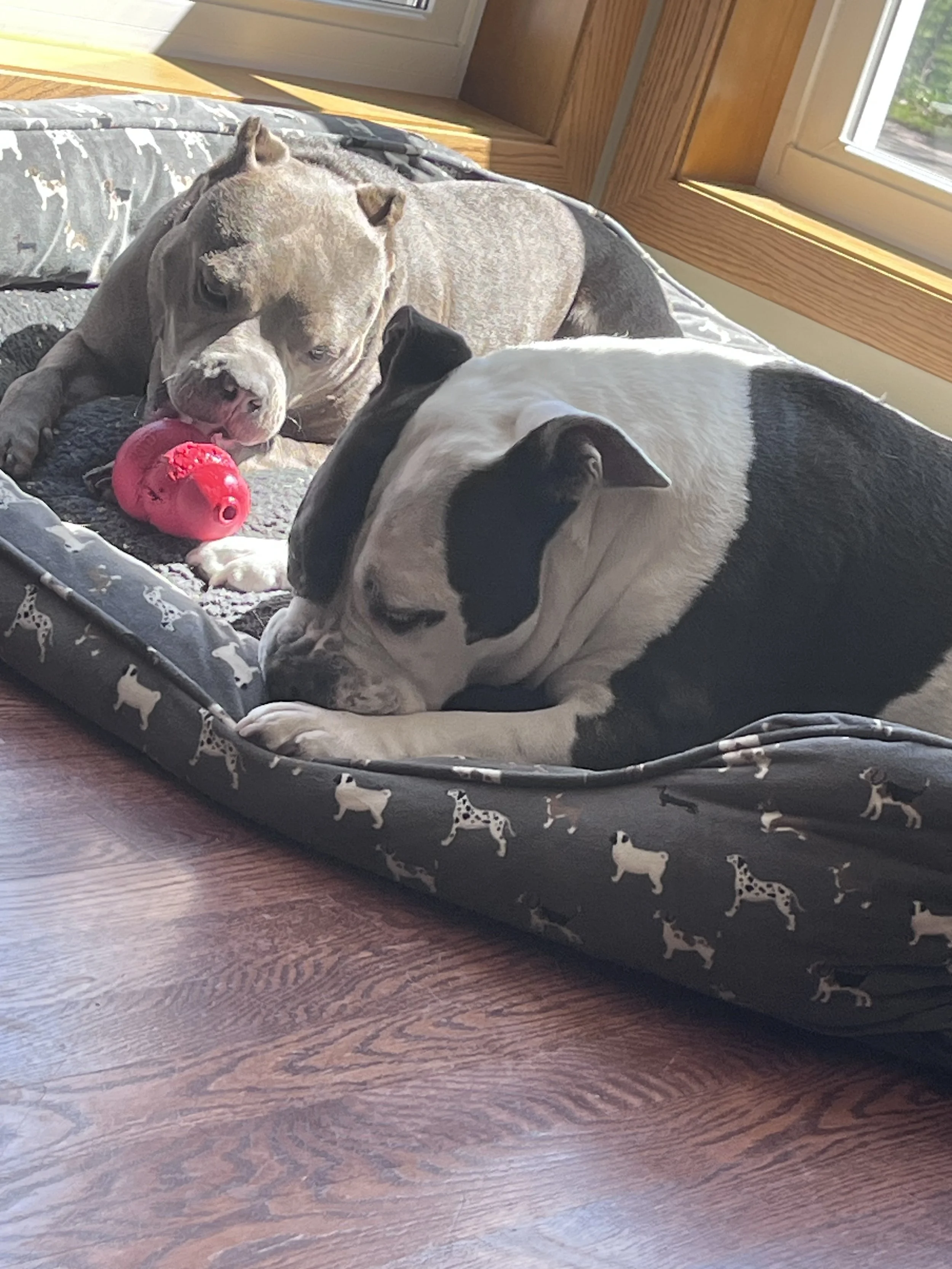 Ce & Fi share a bed chewing on their own toys.